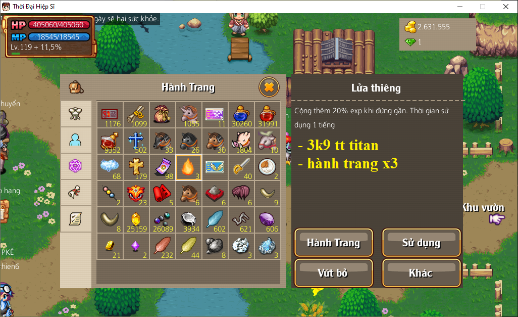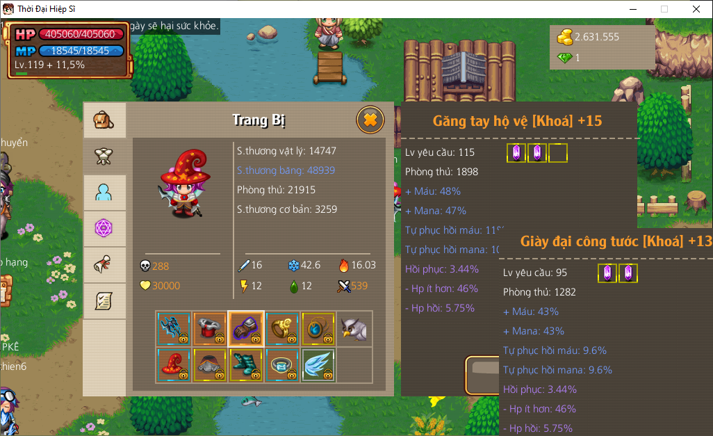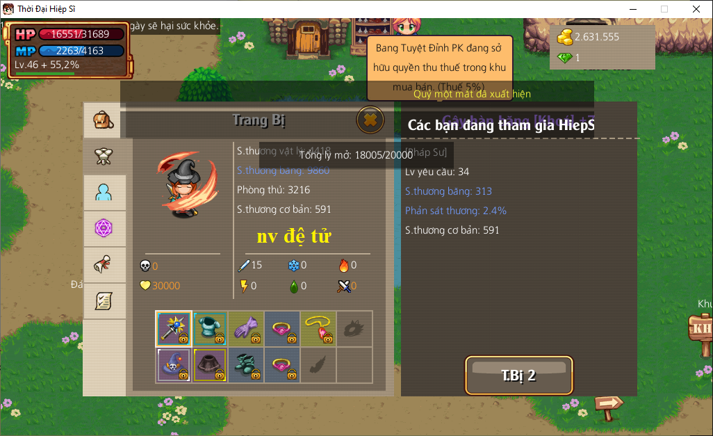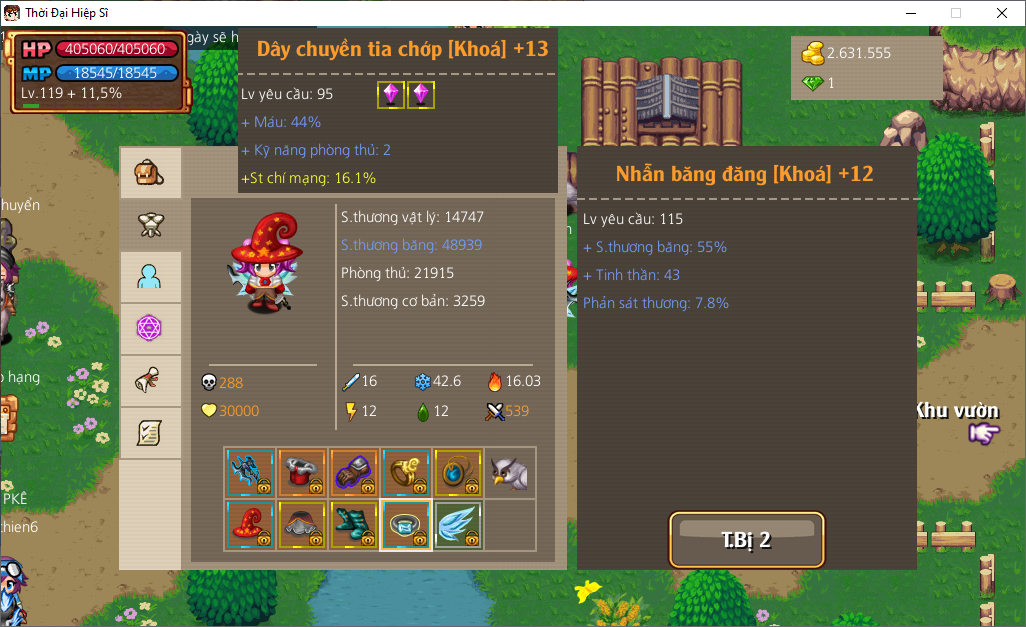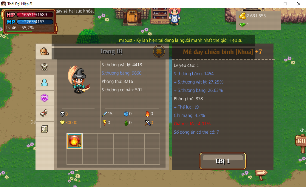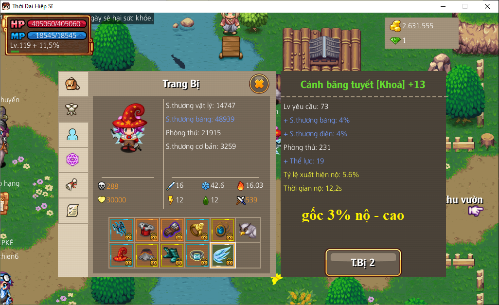 Nổi bật: Có đt, vk +12 găng +15, cánh +13 5,6% nộ, pet cú max 128 tl, mđ cam +7 2d stb % máu % hồi máu % khiên ma thuật, có skill băng trận, hành trang x3, nhiều nl mđ vàng, 3k9 tt, 37 vé buôn, tóc 100n, km 2tr6 vàng