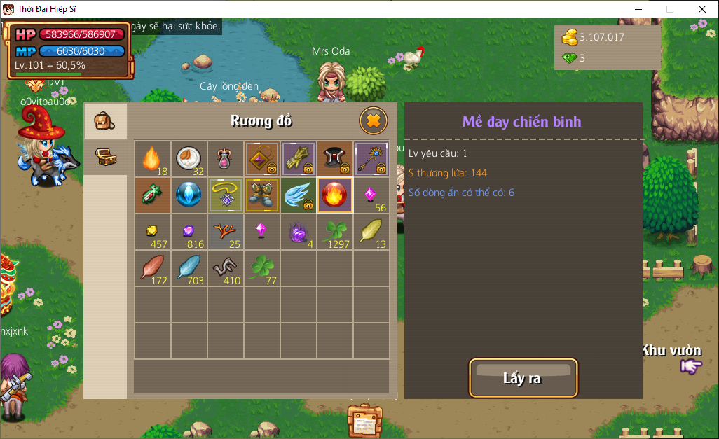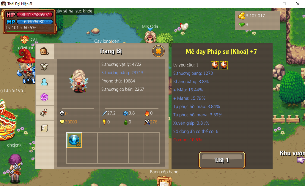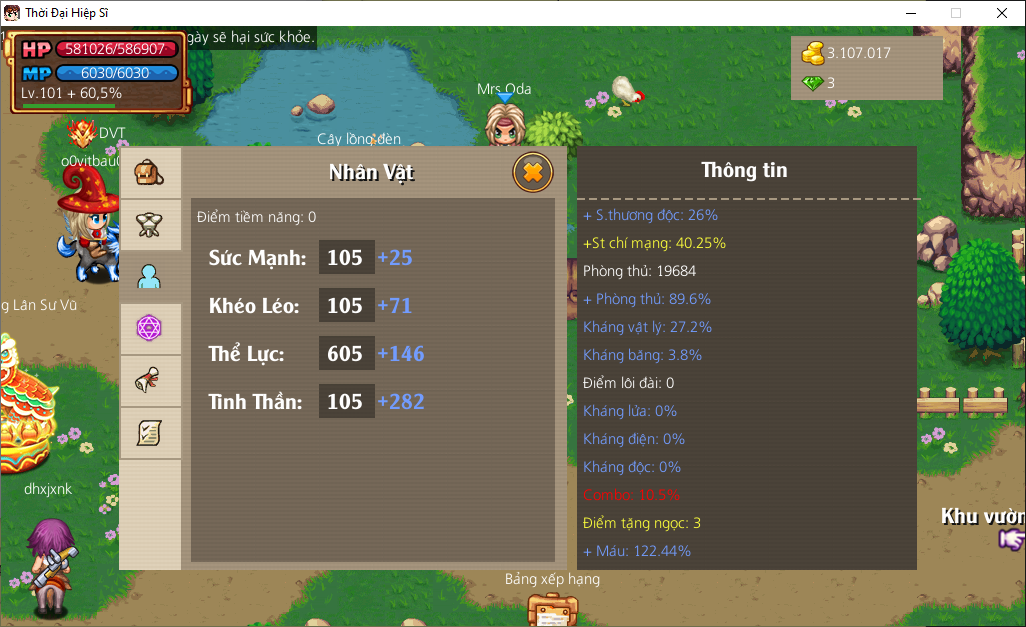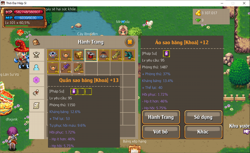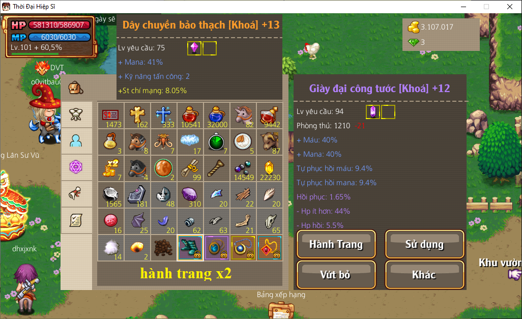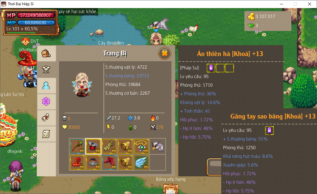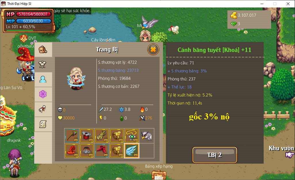 Nổi bật: Vk 12 đồ 12 13, cánh +11 5,2% nộ, 276đ ct, pet cú max 128 tl, mđ +7 % máu % hồi máu % xg, hành trang x2, 1k5 tt, tóc 100n, km 3tr1 vàng