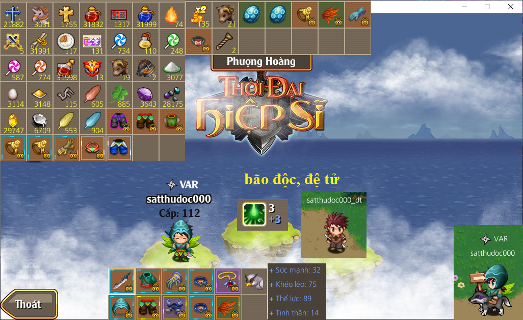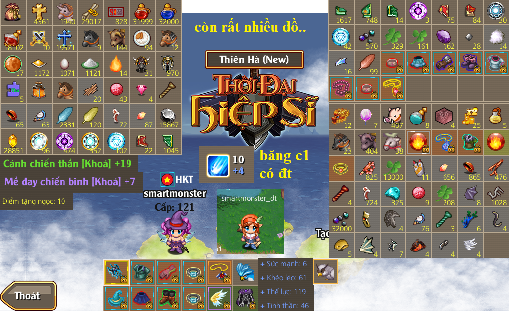 Nổi bật: Có đt, vk +13 đồ 12 13, cánh +13 5,6% nộ 6% stb, pet cú max 128 tl, mđ tím +6 % máu % hồi máu +1 kntc, hành trang x2, 4k8 tt, nhiều vật phẩm, 1 trứng zabi 30n, cánh phụ tl +10