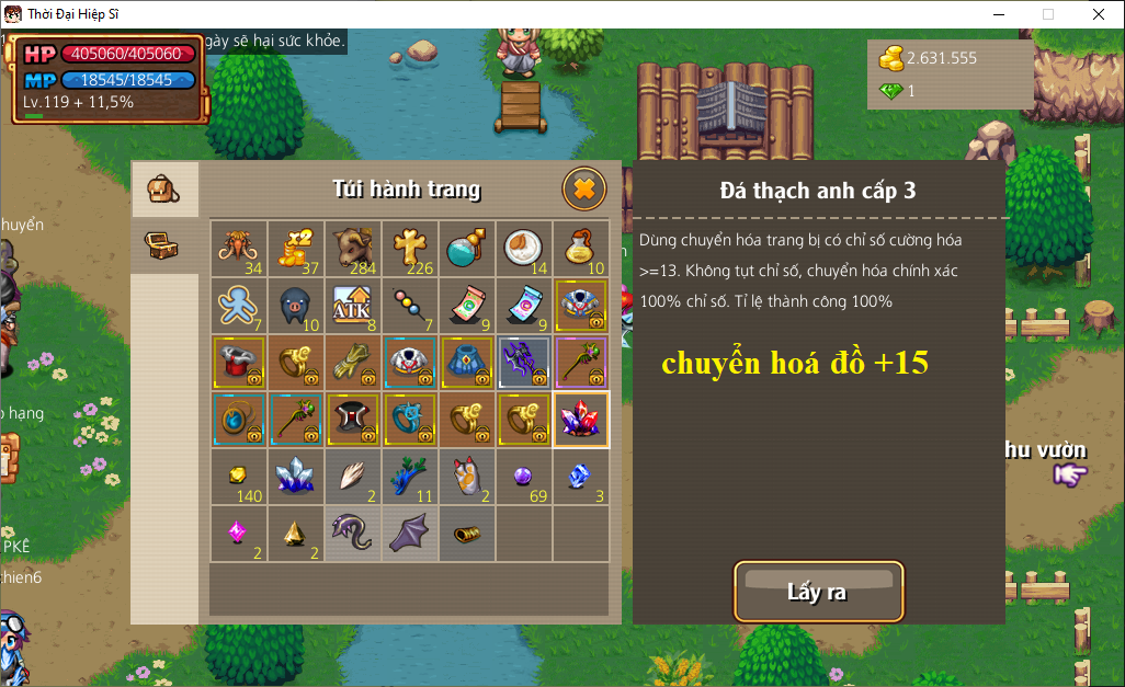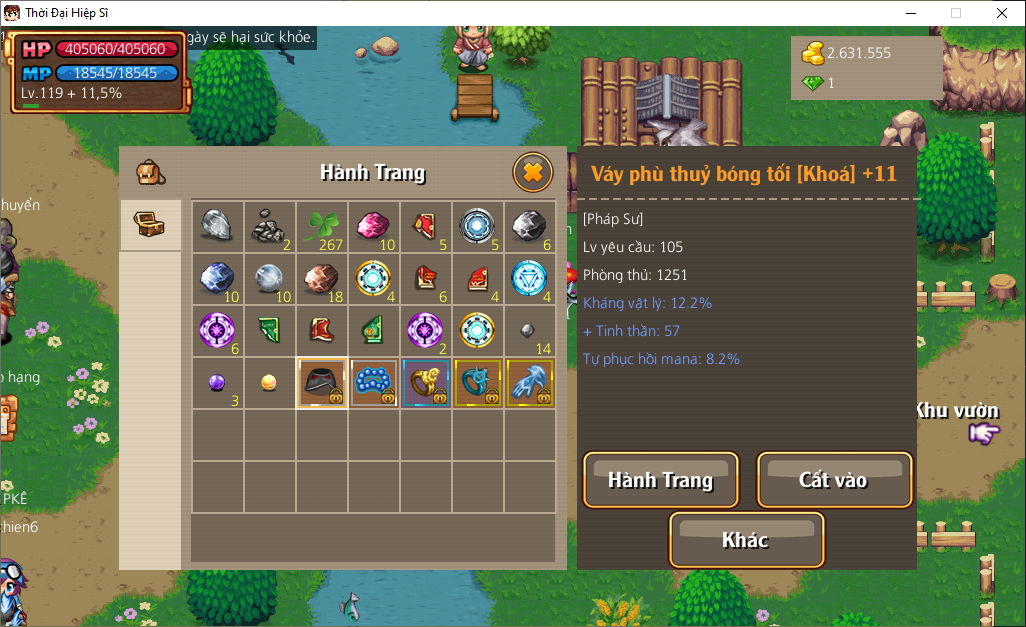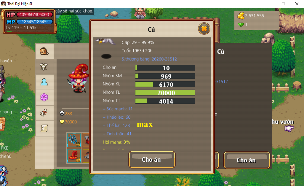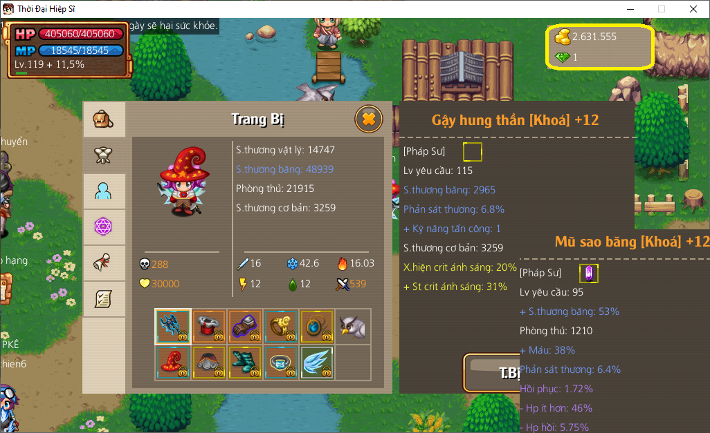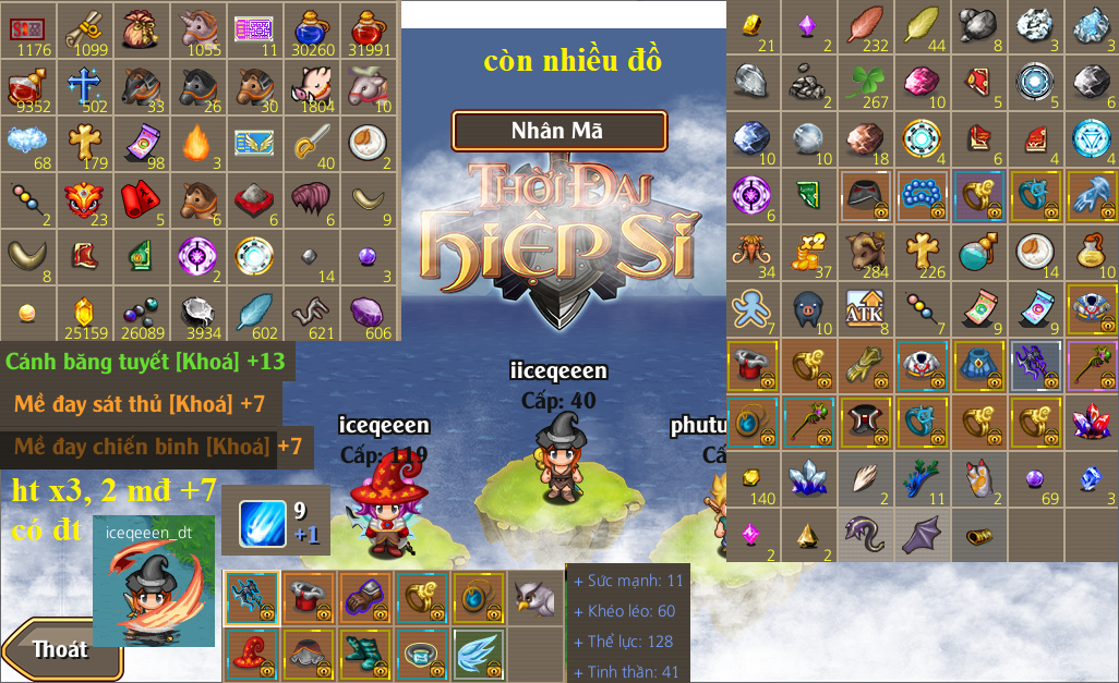 Nổi bật: Có đt, vk +12 găng +15, cánh +13 5,6% nộ, pet cú max 128 tl, mđ cam +7 2d stb % máu % hồi máu % khiên ma thuật, có skill băng trận, hành trang x3, nhiều nl mđ vàng, 3k9 tt, 37 vé buôn, tóc 100n, km 2tr6 vàng