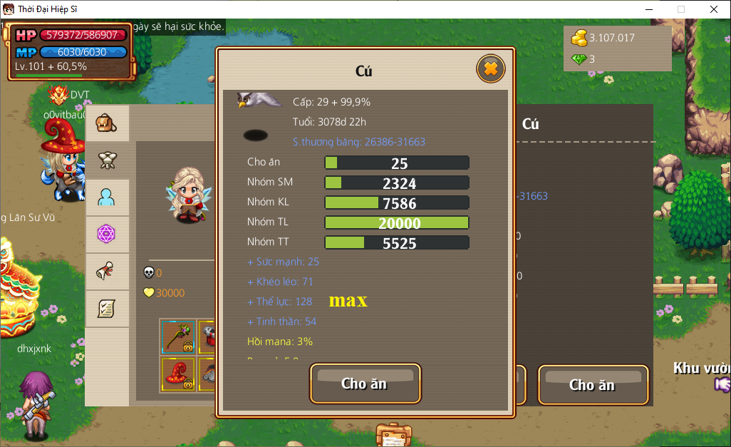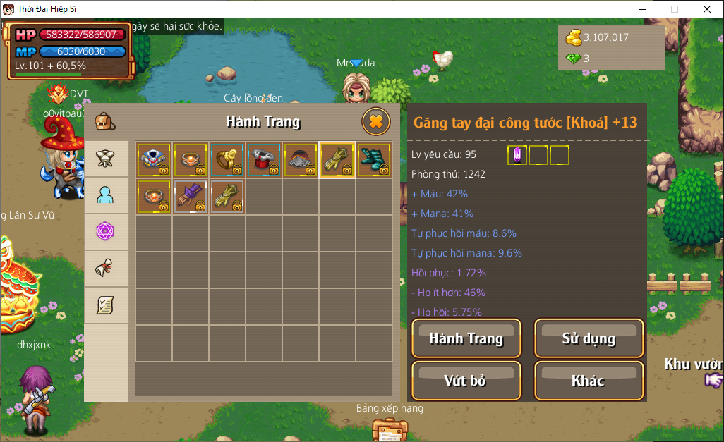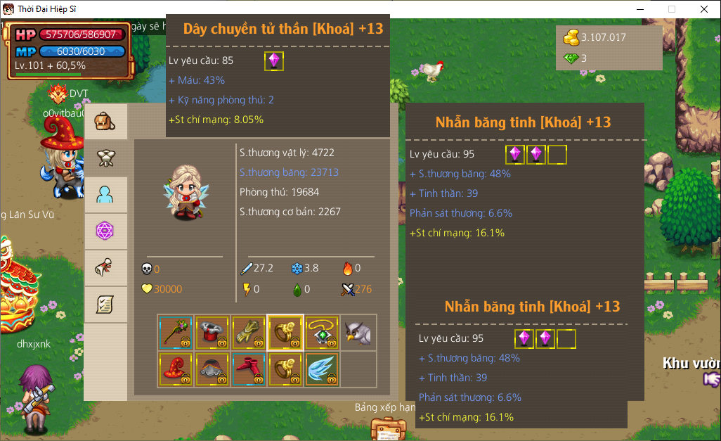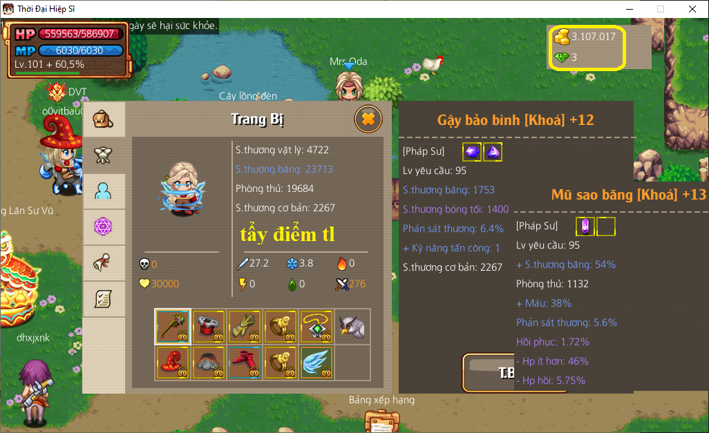 Nổi bật: Vk 12 đồ 12 13, cánh +11 5,2% nộ, 276đ ct, pet cú max 128 tl, mđ +7 % máu % hồi máu % xg, hành trang x2, 1k5 tt, tóc 100n, km 3tr1 vàng
