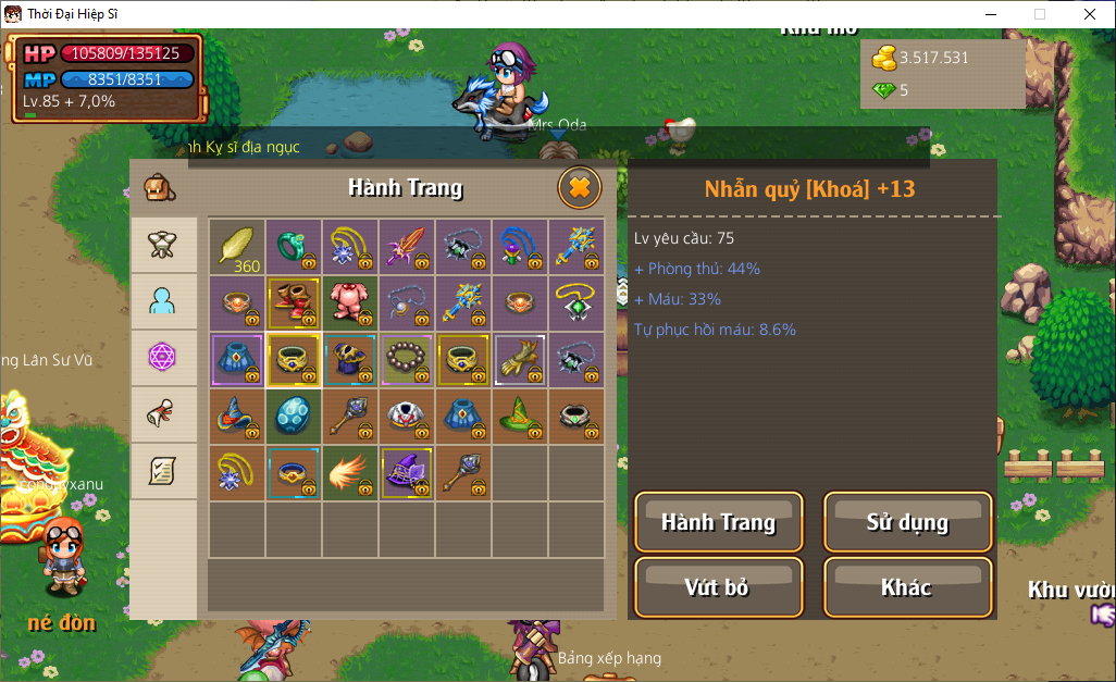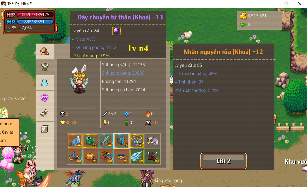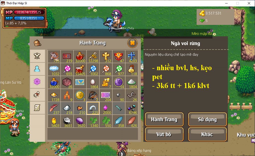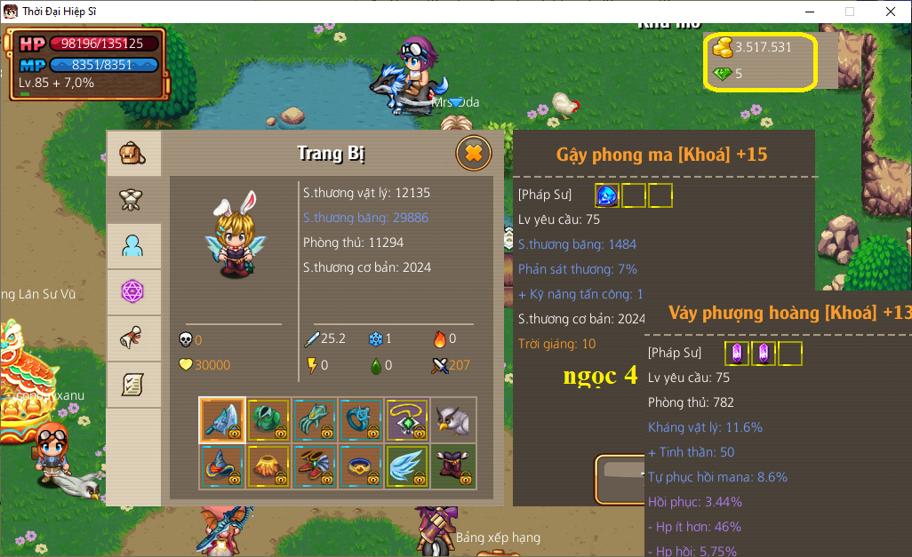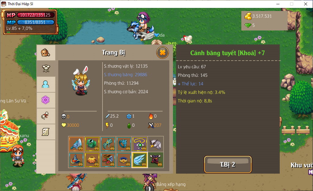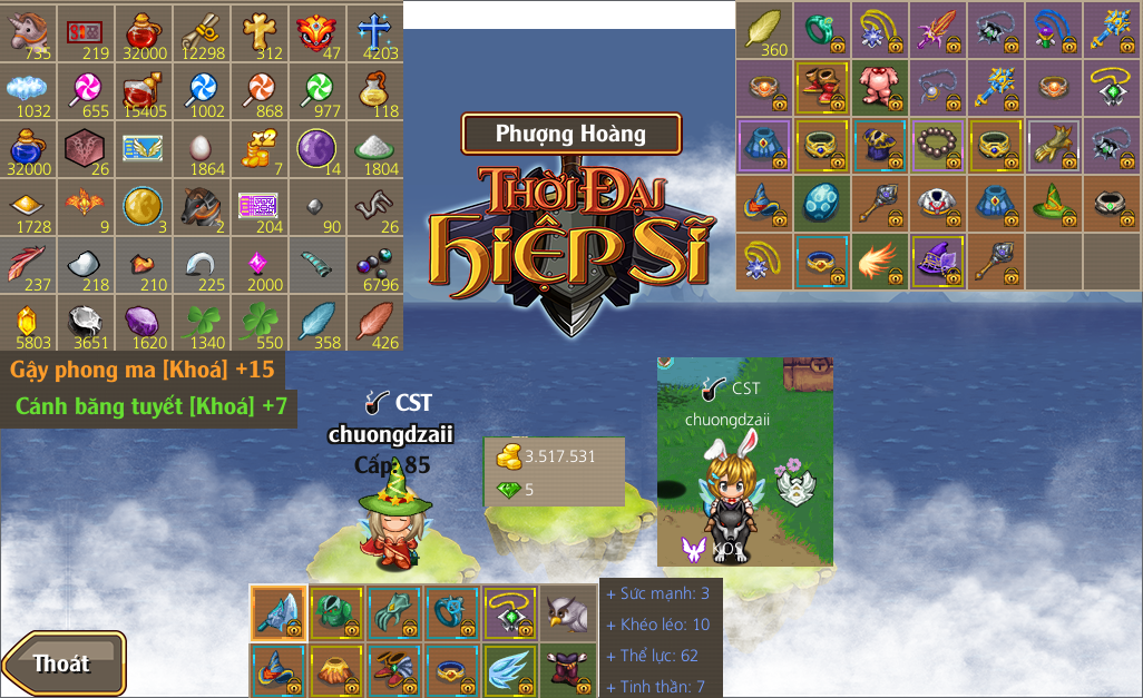 Nổi bật: Vk +15 n4 váy 13, cánh +7 3,4% nộ, 207đ ct, pet cú 62 tl, hành trang x2, nhiều kẹo pet, 3k6 tt + 1k6 klvt, km 3tr5 vàng
